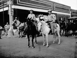 Elpen, Jim; Merchant, Mack; Rubberless Parade; Parades; Horses; Carriages & coaches; Buildings; Streets; Cowboys Hats; Chaps