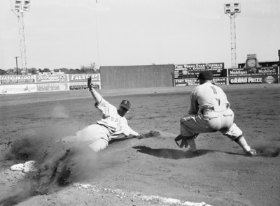The Fort Worth Cats are facing their Texas League rival, the Dallas Rebels. Image shows an unidentified player sliding to home base for a score on a run. The Cats won the game 12-3.