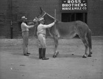 Colonel C. A. Wilkinson measuring a mule for pack purposes in the United States Army. This particular mule was not purchased because it was too tall and too heavy, but Colonel Wilkinson stressed the fact that the mule had the deep body, good legs and feet and general conformation desired. The colonel is in uniform with boots up to his knees. His right hand is holding a tall wooden measuring stick next to the mule. There is an unidentified man, at left, holding the harness of the mule, just behind the Colonel. He is wearing trousers, laced up shoes, a long sleeve shirt and a straw hat. Behind the two men and the mule is a brick building with the word "Office" painted on it and a large sign, over an opening, that reads "Ross Brothers Horse and Mule Company" in Mule Alley of the Fort Worth Stockyards.