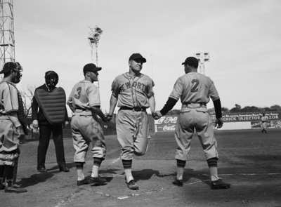 The Fort Worth Cats are facing their Texas League rival, the Dallas Rebels. Image shows two of the players congradulating the other for a good play. The Cats won the game 12-3.