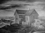 A rural scene in oils, by Coreen Mary Spellman of Denton, Texas is one of a varied assortment of exhibits from Texas State College for Women which is represented by jewelry and pottery as well as the art of painting and print making. The show will remain through August. The focus of the painting is a small shack with clothes hanging, two barrels, smoke leaving a chimney, and both logs & tires strewn about. There is a truck-parked just in front of the shack, and a woman just behind the shack appears to be gathering something. A bridge crosses over a stream in the distance.