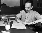 John Sparks at his desk. Mr. Sparks is seated in the center right of the photograph at his desk. He is wearing a stripped button up shirt with sleeves rolled up, a stripped tie that is loose with a tie chain around it, and his hair slicked back. He is writing on a paper in front of him with his right hand, while his left hand holds the paper steady. Mr. Sparks has dark hair, a mustache, and is smiling happily. To his left is a typewriter, on the other side of the paper he is writing on is a paint brush sticking out of a container, and to his right are various papers and office supplies. In the bottom left corner of the photograph is a small portion of the rotary telephone on his desk. In the background two windows can be seen with the view from his office visible.