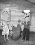 Recreation Department. Circus. Luise Lockland in Greta Garbo costume, Billie Jack Harper dressed as Popeye, seen outside standing beside a turkey figure.