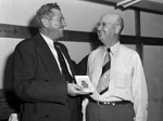 Police Chief Curry, right, receiving badge from James M. Floyd, attorney.