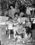 Army Air Forces Flying Training Command Officers. Offsprings. Mrs. Donald Hamilton reading to Carolyn Bushey, standing; Ann Wilson, left; Camilla Canfield, on the sidewalk with her doll, and Ann Lee, in the chair at right.