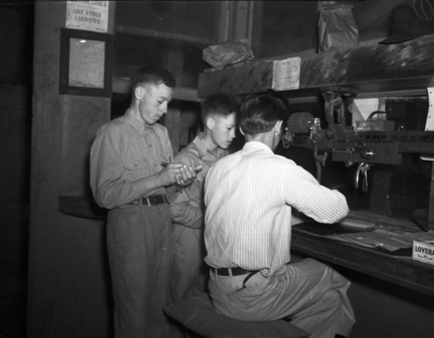 Here are 4-H and Future Farmers of America (FFA) Club boys from the recent Nolan-Fisher Club Boys' Livestock Show as they marked their animals in Fort Worth this week, with pictures of two of the champions. Shown in the picture are the boys taking lessons in weighing at the Fort Worth Stock Yards. James Phillips, left, taking weights from weighmaster Jimmie Cox while Hubert Phillips looks on.