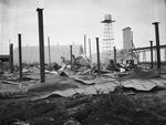 A fire leveled a mill structure. The smoldering ruins of a warehouse at the Kimbell Milling Company shelling plant is shown after the fire was extinguished. The plant is south of the Fort Worth Quartermaster Depot on Highway 81. Principal loss to the galvanized iron building and the machinery inside was estimated at $20,000.