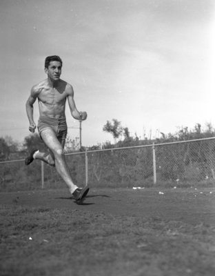 This well conditioned athlete is Arthur LeBlanc, football and track star of Poly High. Last year he won the mile run for his team in the city meet and will be out to repeat in Friday night's event. Coach Charley Berry's team figures to be well up in the final standings.