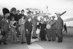In the front row,(left to right) are Chanlder Hovey of Boston, Harllee Branch of Washington, Edgar M. Queeny of St. Louis and Silliman Evans of Nashville, Tennessee, and Chicago. Rear row: Major J. Woodall Rogers of Dallas, Harold P. Ames of Chicago, Harry E. Benedict of New York City, Mayor Maurice Tobin of Boston, President A. N. Kemp of American Airlines (shaking hands ) Fred F. Florence of Dallas, Lang Wharton of Dallas, Raymond E. Buck, Fort Worth; Mayor I. N. Hc Crary of Fort Worth; Ben E. Keith and Amon Carter Unsed and unidentified negatives.
