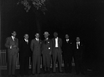 Amon Carter, Sr. (center), and A. N. Kemp, president of American Airlines (third from left) stand with a group of unidentified men at Shady Oak Farm during the American Airlines party.