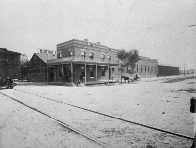 Two views from the colorful past of the lumber industry in Texas and the dean of Texas lumberman, Willard Burton, former Fort Worth mayor, who will be given recognition along with other "old-timers " of the industry when the Lumbermen's Association of Texas opens it' annual convention at Hotel Texas. Shown here is an Early-day office and part of the yard of the same company at El Paso, Texas