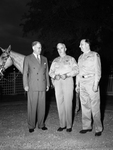 A. N. Kemp, President of American Airlines, stands next to two unidentified men on the grounds of Shady Oak Farm during the American Airlines party. The men are standing in front of a horse, and the two on the right are wearing what appear to be a United States Army or Army Air Corps uniforms.