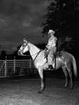 An unidentified man on horseback at Shady Oak Farm during the American Airlines party. The man is wearing what appears to be a United States Army or Army Air Corps uniform.