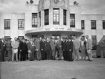 Trail-blazers on American Airlines' new international service between the United States and Mexico were greeted on their arrival in Fort Worth by civic and business leaders. Among the attendees were Chandler Hovey of Boston, Harllee Branch of Washington, Edgar M. Queeny of St. Louis, Silliman Evans of Nashville and Chicago, Mayor J. Woodall Rogers of Dallas, Harold P. Ames of Chicago, Harry E. Benedict of New York City, Mayor Maurice Tobin of Boston, President A. N. Kemp of American Airlines, Mayor I. N. McCrary of Fort Worth, Fred F. Florence of Dallas, Lang Wharton of Dallas, Raymond F. Buck, and Amon Carter, Sr. This photograph was taken in front of the main terminal building at Fort Worth Meacham Airport.