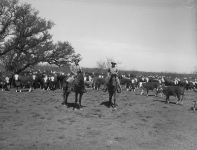 The Quincy Corbett Ranch near Caddo, Stephens County, is an interesting place nowadays with 2,000 yearlings making gains of something like two pounds a day. Shown here in this picture are two of the cowboys on the ranch, Left to right, John Clark and Ervin Cohron. Cows can be seen in the background.