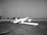 Storm at Meacham Field resulting in an over-turned airplane owned by H. D. Norris of Brownsville, Texas. It was one of several damaged during a thunderstorm. The single engine propeller plane sits upside down in a grassy area. This photograph was published in the September 7, 1942 morning edition of the Star-Telegram.