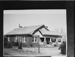 Photo of J. Frank Norfleet home. It is a simple bungalow with brick walls and large front covered porch. There is a barbed wire fence in the foreground. The top of windmill seen in the background and chicken in the front yard.