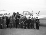 Amon Carter with a group of unidentified people standing on the tarmac after departing an airplane called The Flagship at an airport, possibly in Mexico City, after American Airlines' inaugural international flight.