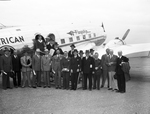 Amon Carter with a group of unidentified people standing on the tarmac after departing an airplane called The Flagship at an airport, possibly in Mexico City, after American Airlines' inaugural international flight.