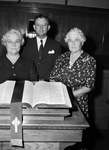 Reverend E. R. Gordon (center) pastor of Highland Park Methodist Church. Mrs. Claude V. Morrison, left, and Mrs. G. W. Powell, right.