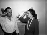 Mrs. Opal Nichols, chief clerk of Tarrant County Selective Service Board Number 2, teaching her husband, Troy H. Nichols, how to salute.