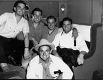 Texas Christian University (T. C. U.). Frog and Band leaving for Los Angeles. Players: left to right, Derrell Tipps, Derrell Palmer, Mike Harter, J. B. Smith. Seated is Billy Blackstone.