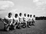 Amon Carter Riverside High School football team starting line. Left to right, Loyd Adams, Dale Sanford, Jack Wofford, Bill Boyce, Spurgeon Sutherland and Raymond Doyle and E. F. Crites.