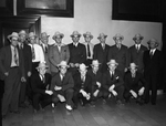 Texas Christian University senior athletes their coaches were awarded "Shady Oak" hats from Amon Carter. Standing left to right, in the front row is: Spud Taylor, Charley Williams, Mac Best, Earle Clark, Linden Binion and Woodrow Duckworth. In the back row, stanidng left to right is: Athletic director Howard Grubbs, Coach Mike Brum, Dunward Horner, Amon Carter, Glenn Chamberlain, Don Looney, Jack Perryman, Gail Smith, Bob Cook, Melville Ehlers and Coach Dutch Meyer.