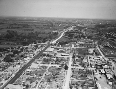 Image shows Aerial view of the new portion of Boulevard section of East Lancaster Avenue in Fort Worth to be opened April 3, 1940. The view is looking west toward the business district, showing the terminus of the new concrete lane at Virginia Street. Published in the Fort Worth Star-Telegram morning edition April 5, 1940.