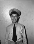 J. .T. Edwards, yeoman third class, has set up an office in the basement of the United States Courthouse to enroll Fort Worth, Texas, men in the United States Maritime Service. Men who are between the ages of 18 and 34 and who can obtain clearance from their draft boards are eligible. Those under 21 must obtain parents' consent, and married men must obtain the consent of their wives. Three letters of character reference are required of all applicants. Enrollees draw a beginning salary of $50 per month for three months and receive deck officer or engineering training, qualifying them for salaries of $150 to $400 per month. Edwards is wearing his uniform, which consists of a collared shirt, dark colored necktie, trousers and a cap.