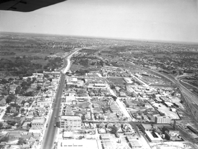 Image shows Aerial view of the new portion of Boulevard section of East Lancaster Avenue in Fort Worth from the Ritchy Flying Service Plane, to be opened April 3, 1940. The view is looking west toward the business district, showing the terminus of the new concrete lane at Virginia Street. Published in the Fort Worth Star-Telegram morning edition April 5, 1940.