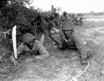 Camp Hood. Dedication. Sergeant Henry Roberson, left, and Corporal Alphonso Thorne, armed with bolo knives, and wearing disguise.