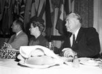 Patriotic luncheon. Left to right, Lewell Lafferty, Miss Janet Gaynor and Nigel Bruce.