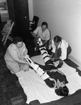 Red Cross. First Aid. Mary Kate McCuistion playing victim as trio practice on traction splints. Mrs. John Cadwallader, left, J. W. Simmons center and Harris Burton.