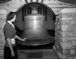 Scrap Metal Salvage Campaign. Miss Merle Isbell looking at the old Central Fire Station Bell which is to be donated to the drive.