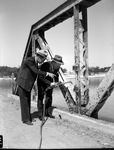 Scrap Metal Campaign. County Engineer Cook, left, and Commissioner Winters, armed with acetylene torches, examining the Ash Creek Bridge.