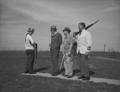 Photographed here at the Sportsman's Rod and Gun Club were a group of shooters and Mr. and Mrs. Fred Etchen of Wichita, Kansas, who teach safety with guns as well as how to shoot targets. Shown here in the picture are, left to right, Mr. Chester Snyder, Mr. F. Kirk Johnson, Mr. A. B. Wharton Junior, and Mr. James Goodwin Hall.