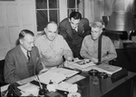 Military priorities are the subject of the conference at the Chamber of Commerce, Fort Worth, Texas. From left to right are Francis B. Howard, regional supervisor of War Production Board (WPB) review analysts; Colonel Harvey E. Hanna, chief of procurement division of the Quartermaster Depot; J. A. Messineo, WPB review and approval analyst; and Captain Manion F. Jones, Quartermaster Depot priorities officer. Mr. Howard, Colonel Hanna and Captain Jones are sitting at a desk while Mr. Messineo is standing behind them. Mr. Messineo and Mr. Howard are wearing suits. Colonel Hanna and Captain Jones are wearing their military uniforms. On the desk are various documents, a telephone, a pen and a lamp. Published in Fort Worth Star-Telegram.
