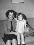 Mrs. James R. Holden and daughter, Janice, 3, sitting on the couch. Janice is propped up with pillows and has her arm around mom's neck. From Washington, D. C., they are visiting Lieutenant Holden's parents, Mr. and Mrs. William Holden. Lieutenant Holden is in the Bureau of Ordnance, Navy Department. Mrs. James Holdem is wearing a blouse with buttons down the front and a skirt. Janice is wearing a dress.
