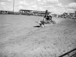 Calf roping contest at Midland. Burk makes a quick catch. Shown is Burk riding on a horse and capturing a calf that is running away. Burk has held the title of champion cattle roper for two years. His fastest time for capture was 15 seconds. Behind him, a fence with a crowd of people looking on can be seen.