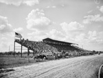 Calf roping contest at Midland. Shot of the stands where crowds of people can be seen looking on at the contest. AT the base of the stands is a fence that circles around the area and a parked car at the side. At the top of the stands is a flag.