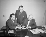 Signing up for the three hundredth membership in the Fort Worth Chamber of Commerce continuous membership drive is Reverend Wayne Alliston, right, manager of the new Pennsylvania Avenue Hospital. Shown with him are LeRoy N. Olmsted, left, leader of one group in the contest, and Ed G. Parker, center (standing), the campaign chairman. Mr. Olmsted and Reverend Alliston are seated at a table. They are all wearing suits. Mr. Olmsted and Mr. Parker are wearing eyeglasses. On the table are various documents and a telephone. Mr. Olmsted is holding an object that reads "Member Chamber of Commerce 1942 Fort Worth". Published in Fort Worth Star-Telegram, morning edition, October 4, 1942.