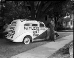 This old ambulance was donated by Richard B. Phillips to a scrap metal salvage campaign. Mr. Phillips is standing beside the automobile. The phrase "Donated for Hitler's last ride" is prominently painted on the side of the vehicle.