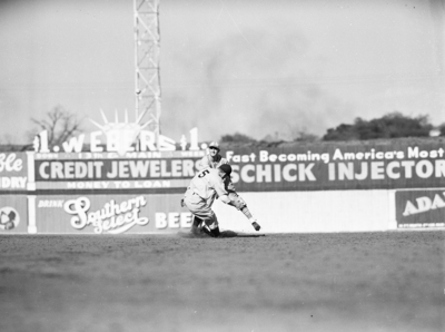 The Fort Worth Cats are hosting the Philadelphia A's in an exhibition game at LaGrave Field. Unidentified players in the outfield battling for the ball. Published in Fort Worth Star-Telegram morning edition April 5, 1940.