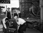 Scrap metal drive. Left to right, A. J. Pittam, John Cordova, F. L. Svitak and C. B. McCafferty, with safe to be donated.