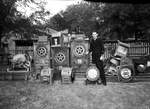 Scrap Metal Drive. Jack Starr, shown with collection of slot machines.