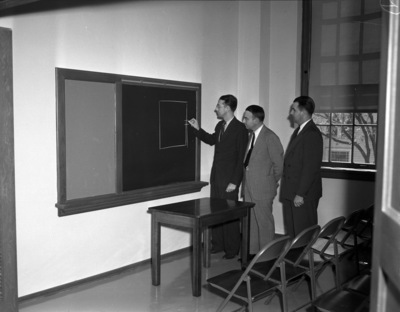 The new $102,000 brick educational building of Broadway Baptist Church is set to open. W. L. Howse, left, educational director, diagrams the four-story structure on a blackboard in a typical classroom while B. V. Nichols, center, building committee member and general attorney for the church, and Carlyle Bennett, music director, look on. All three men are wearing suits.