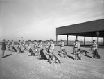Trained Army dogs sitting by the sides of their masters at the Fort Worth Quartermaster Depot.