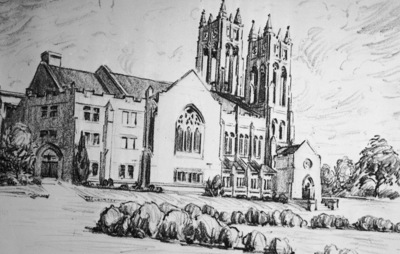 Lithograph by S. P. Ziegler of the First Methodist Church.Clipping: First Methodist Church-a Lithograph. A view of First Methodist Church-a lithograph by S.P. Ziegler, head of the art department of Texas Christian University, who is represented in a print show in the Little Gallery of TCU. The show will continue this week. Published evening edition April 4, 1940. Photograph of an art print depicting the exterior of a church.