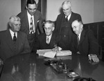 Scrap metal drive. Burlington Lines Officials. Seated, left to right, Division Superintendant J. W. Mode, Amarillo, Texas; C. D. Peckenpaugh, Fort Worth, and Division Superintendant, W. O. Frame, Wichita Falls, Texas. Standing, Donald Ashton, Chicago, Illinois, and Master Mechanic J. L. Roach, Childress.